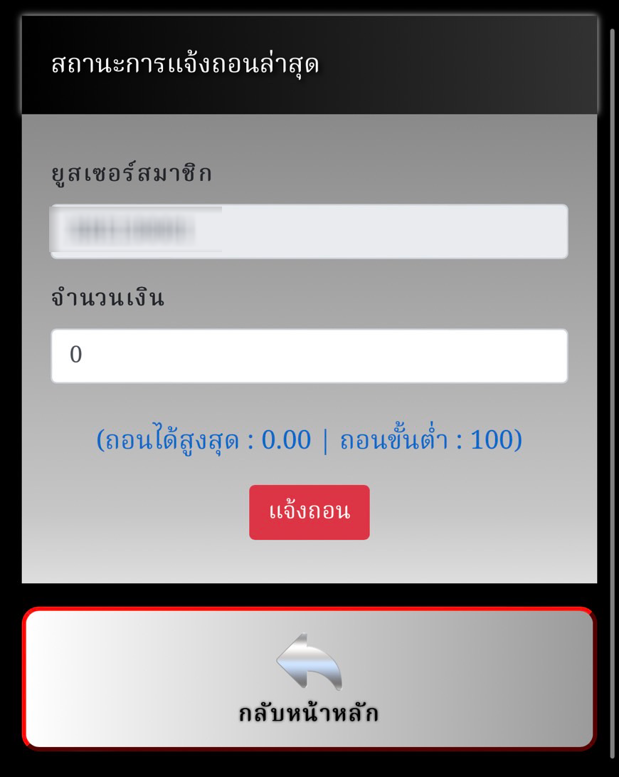 กรอกจำนวนเงินแล้วกดที่ปุ่ม "แจ้งถอน"